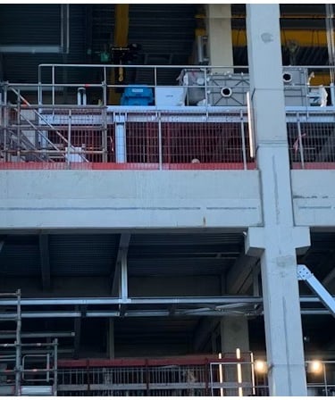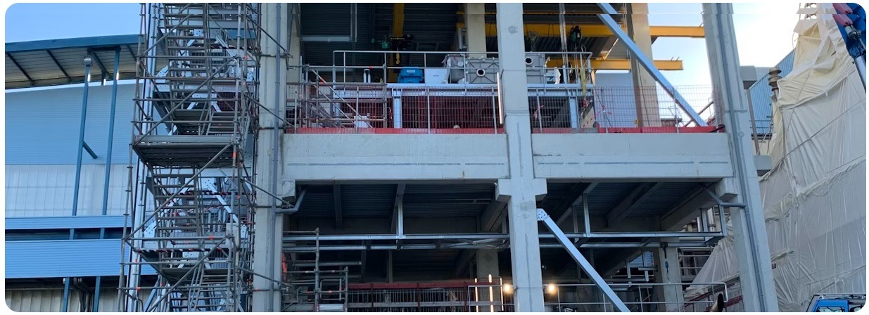 A black-and-white image of an industrial construction site featuring large horizontal pipes and intricate scaffolding structures. The perspective is from above, highlighting the complexity and scale of the construction work in progress. The lighting creates strong contrasts, adding depth and an architectural focus.